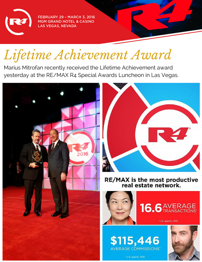 Marius Mitrofan recently received the Lifetime Achievement award yesterday at the RE/MAX R4 Special Awards Luncheon in Las Vegas.